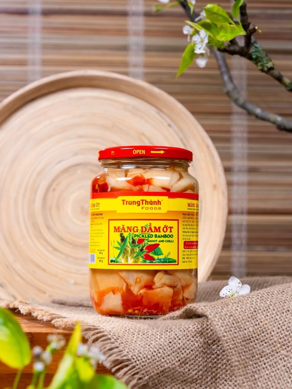 TrungThanh chilli shoots are produced on a modern, closed line according to ISO 22000: 2005, ensuring the best quality and hygiene and food safety. Bamboo shoots planted on TrungThanh farms will be selected, checked for height and diameter until they meet the standards that will be cut and selected. The selected shoots must be fresh, fat, not curved, ... Thanks to modern high pressure pasteurizing technology, the nutritional value of the shoots is kept intact, the products are canned and preserved in a vacuum state. . Chilli bean shoots in the bottle are bright yellow of bamboo shoots, bright red of chilli, acrid aroma and sour taste, light and sweet taste.